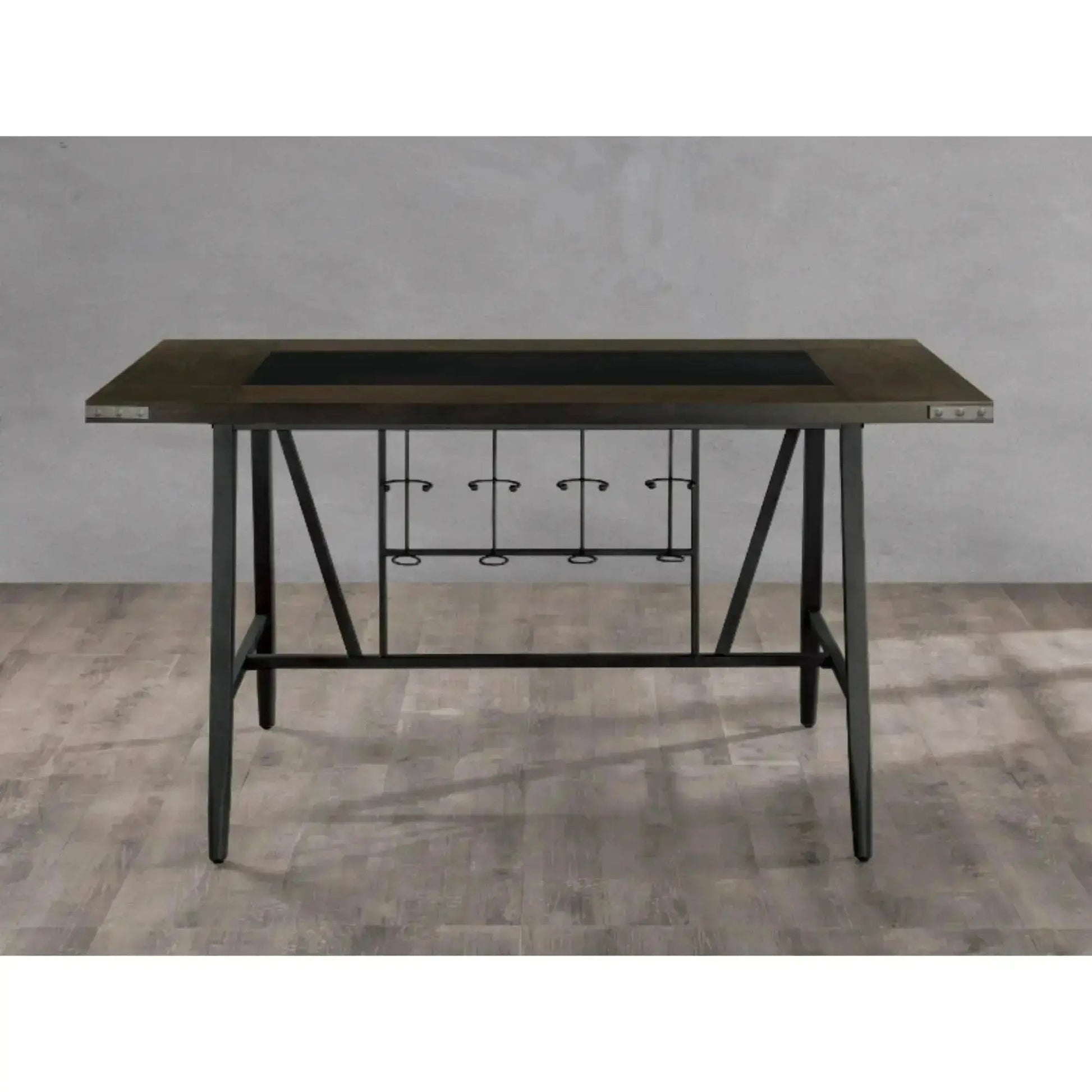 La collection Appert est idéale pour votre salle à manger décontractée. Ce modèle à hauteur de comptoir est doté d'un piètement en métal gris foncé, avec casier à vin intégré, qui soutient le plateau en bois encadrant un insert rectangulaire en verre noir. Les assises et dossiers ronds des chaises qui l'accompagnent sont recouverts de similicuir.