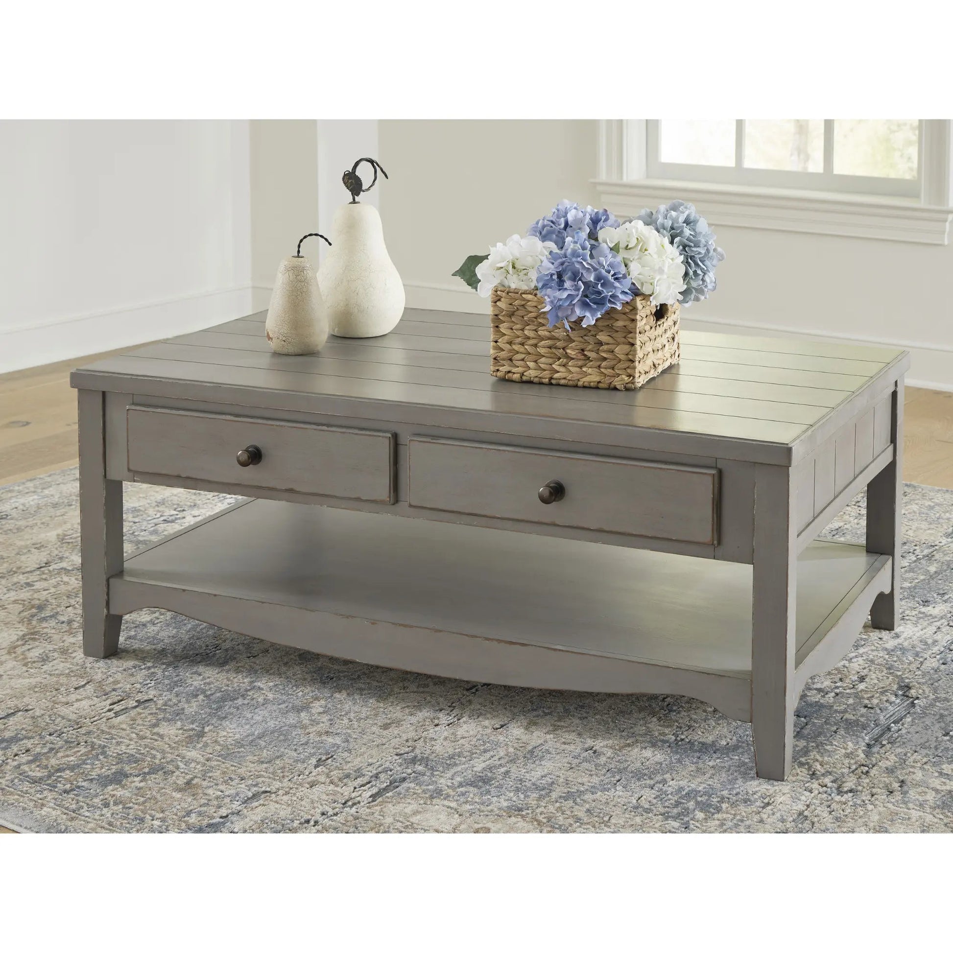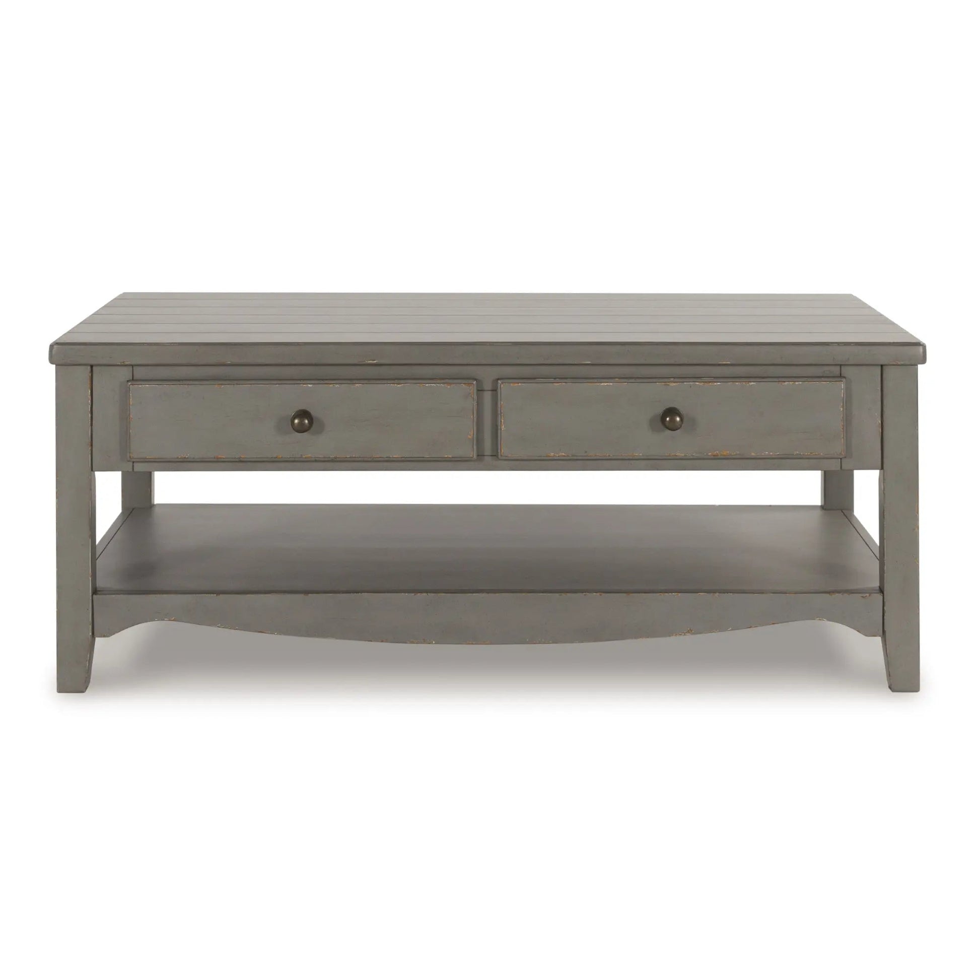 Affichez votre amour pour le style campagnard européen. Avec sa finition gris vieilli effet écaillé pour un look vintage authentique, cette table basse déborde de caractère. Deux tiroirs et une étagère ouverte offrent un espace de rangement et un accès facile aux livres, boissons et autres objets.
