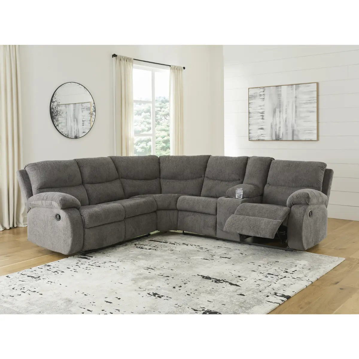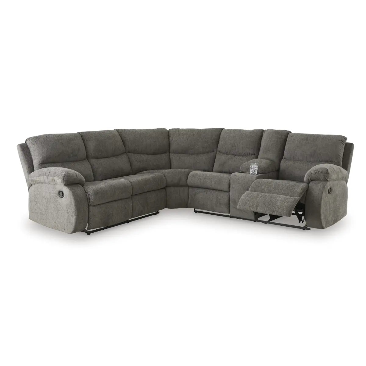 Le confort douillet est à son apogée avec ce canapé d'angle inclinable. D'une douceur veloutée, le revêtement tendance en chenille couleur étain est idéal pour un plaisir quotidien. Rembourrés et élégamment enveloppés, les somptueux coussins et les accoudoirs à plateau-coussin affichent le côté confortable du contemporain. Une console centrale rembourrée avec rangement dissimulé et deux porte-gobelets allie forme et fonctionnalité. D'un simple geste, vous êtes en route pour une détente infinie avec un espace généreux pour vous allonger.