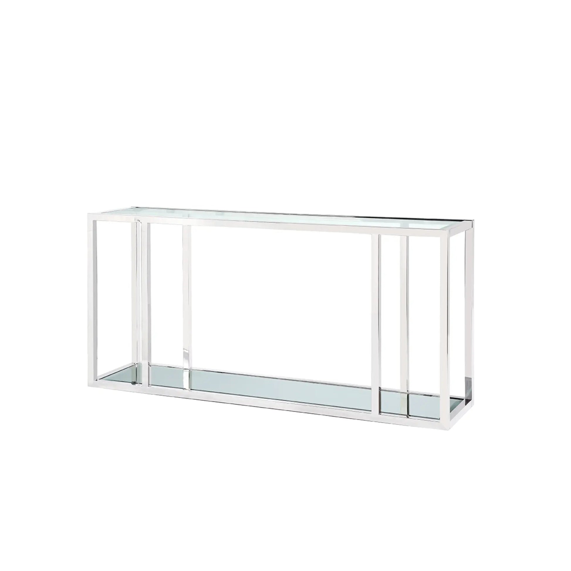 Sublimez votre entrée, votre couloir ou votre salon avec cette élégante console en verre et chrome. Dotée d'un cadre en chrome poli et d'un plateau en verre trempé transparent, cette table offre un design sophistiqué et aérien qui s'intègre parfaitement à un décor moderne et contemporain. Son plateau inférieur en miroir offre un espace de rangement supplémentaire et une touche de glamour, la rendant à la fois fonctionnelle et élégante.