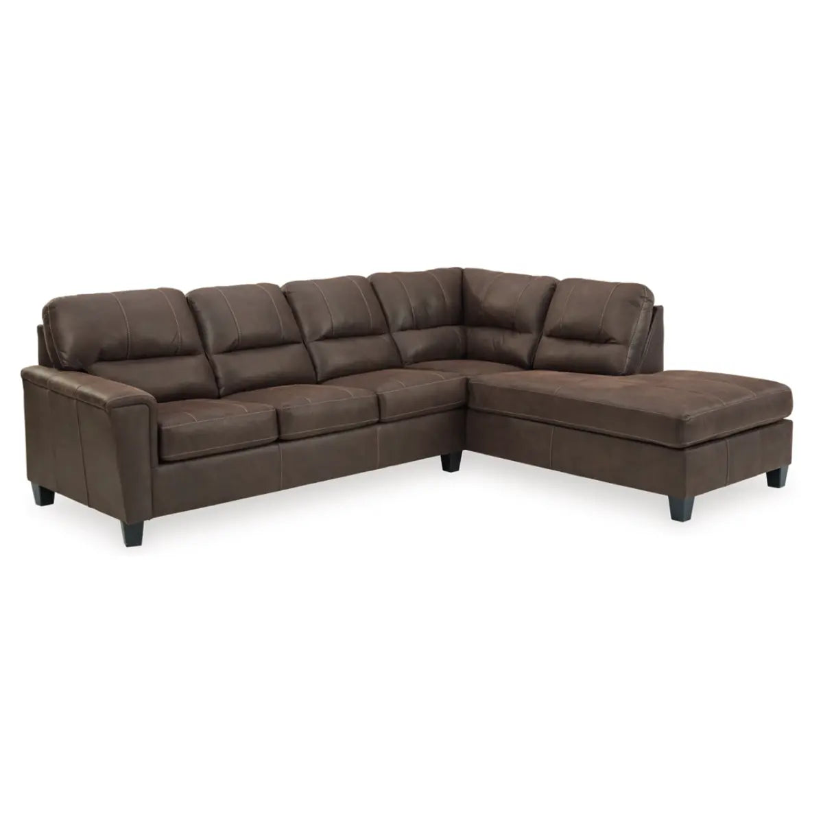 Si vous appréciez l'aspect décontracté du cuir, mais aspirez à la chaleur du tissu, le canapé d'angle Navi vous apportera tout le confort nécessaire. Revêtu d'un fabuleux similicuir aux teintes patinées et à la texture granuleuse qui lui confère un aspect authentique, ce canapé d'angle résolument moderne est la preuve que la sobriété est de mise. Parmi ses atouts, on retrouve des profils latéraux inclinés et des accoudoirs droits recouverts d'une couche de douceur moelleuse pour un petit plus. Des surpiqûres imposantes et un dossier divisé aux lignes épurées lui confèrent une touche avant-gardiste.